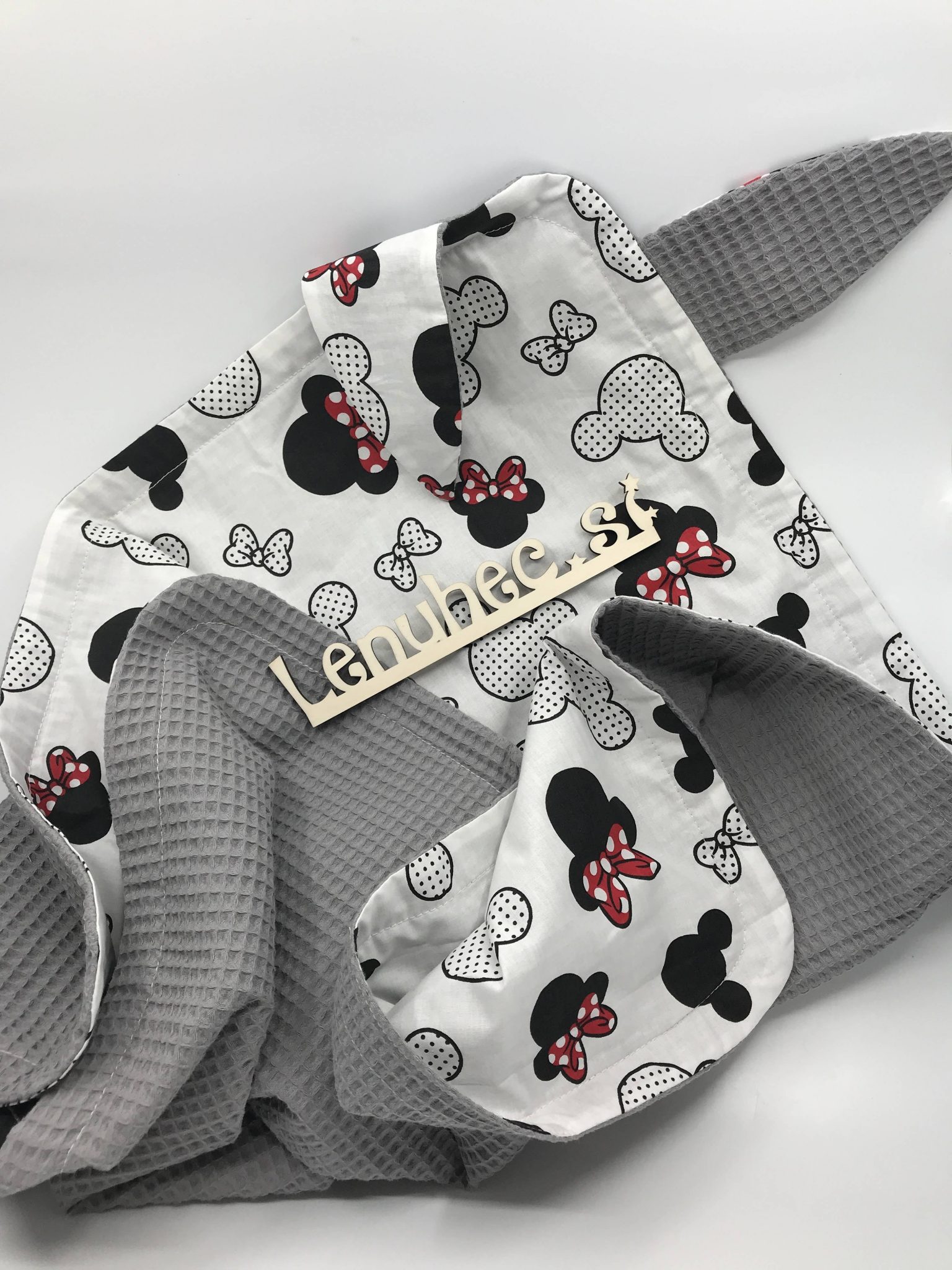 Odejica je obojestranska, na eni strani je vafelj tkanina, na drugi pa 100% bombaž (enobarven ali pa vzorčast). Dvojna tkanina omogoča, da na igralni podlagi ni prehladno, ter v primeru slinjenja le to zelo hitro vpije. Odejica ima tudi čudovita ušeska, ki jih mamice lahko seveda izkoristimo za fotošuting naših zakladov, dojenček pa jih lahko uporablja za igranje ali kot ninico. Tjašin namig: ker je odejica dovolj velika, lahko nanj poleg otroka položite še različne pripomočke, ki bodo popestrili vašo slikico. Sama sem jo uporabila tudi za slikanje ob praznovanju mini svečke. Odločila pa sem se za dve odejici – enobarvno v mint barvi in eno v temno sivi v kombinaciji s čudovitim Miki Miška potiskom.
